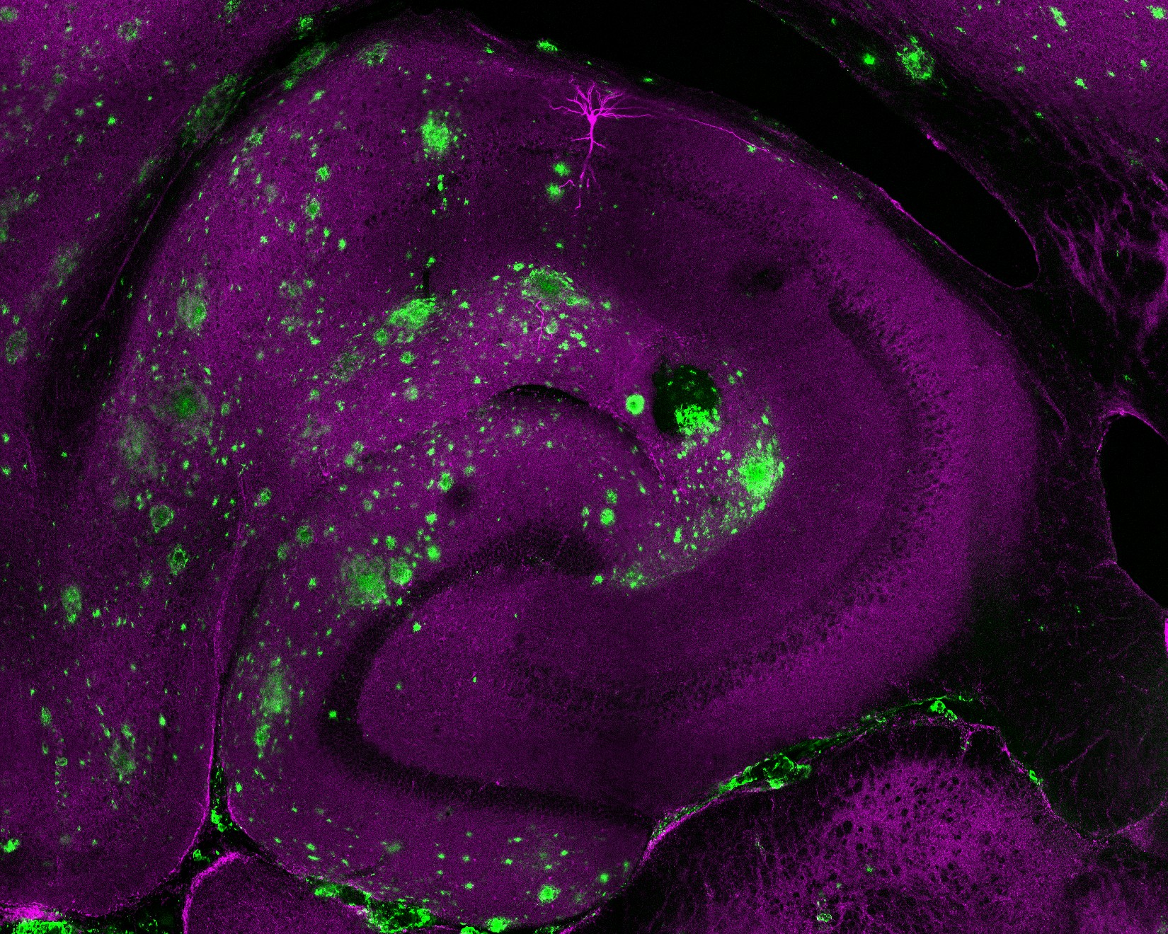 This immunofluorescence image depicts the hippocampus of a 1-year-old APP/PS1 mouse. A CA1 pyramidal neuron (magenta, biocytin labeling) is surrounded by β-Amyloid (green, immunolabeling), which is aggregated into plaques. Image credit: Jamie Elliott.