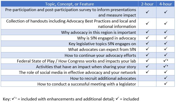 Sessions consists of a two- or four-hour training with a member of the SfN advocacy team. The two-hour training covers all the tips and tricks for being a successful #NeuroAdvocate, while the four-hour training incorporates activities for participants to deepen their involvement with advocacy.
